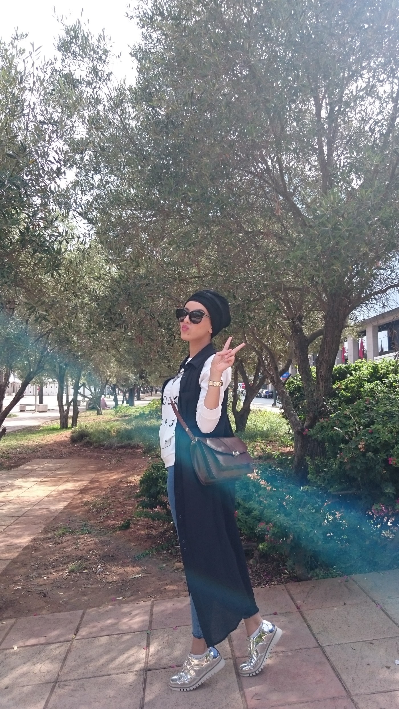Turban – Pashmina / Sunglasses – Gucci / Statement necklace – Freya / Jumper – Kiabi / Sleeveless button-down – Shana / Jeggings – Primark / Brogues – Zara.