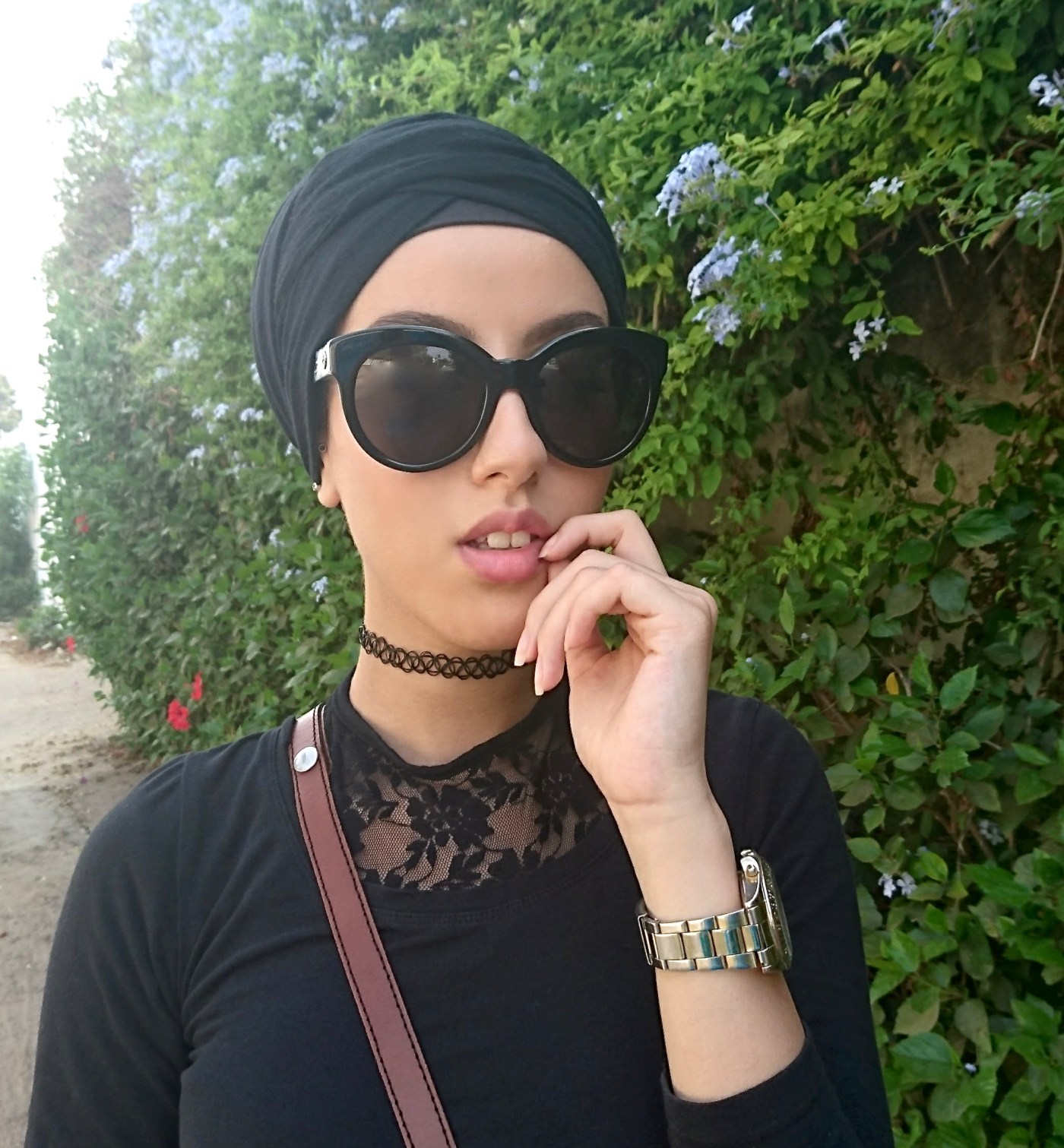 Turban – Pashmina / Choker – Primark (similar here & here ) / Lace top – Shana / Black top – Primark (similar here ) / Sunglasses – Gucci / Button-down – vintage (similar here ) / Jeggings – Primark (similar here ) / Sandals – Kiabi.