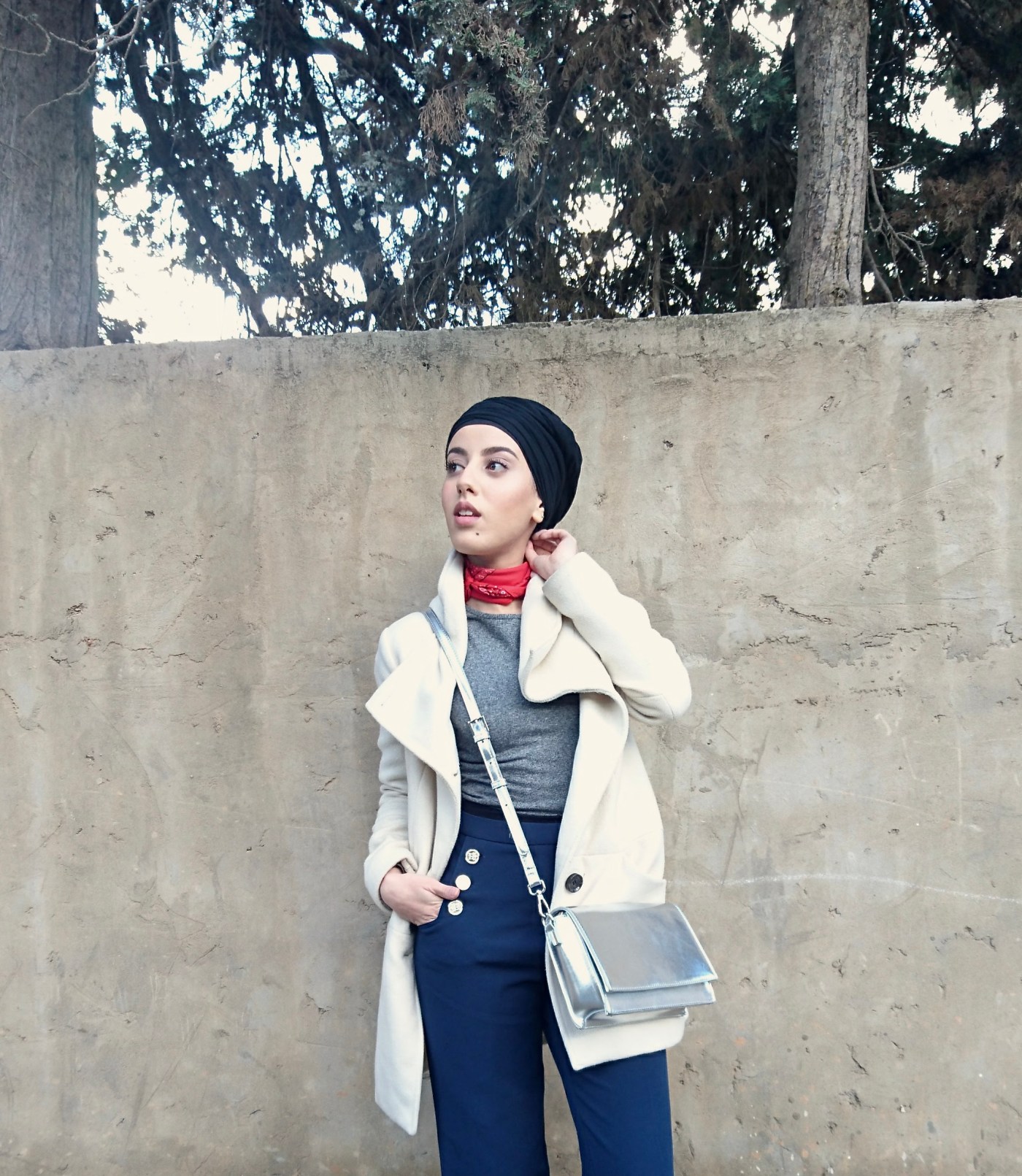Unlike any millenial, I only began liking bandanas recently, which is a shocker for someone who is normally into most trends. The red around my neck broke the whole pattern of neutral colours of this look along with the shiny metallic handbag. Fun fact: I actually wore leggings underneath the trousers because I got cold, and if you squint you can actually see them in some photos (they also made my thighs look thinck, but who’s complainin’?!).