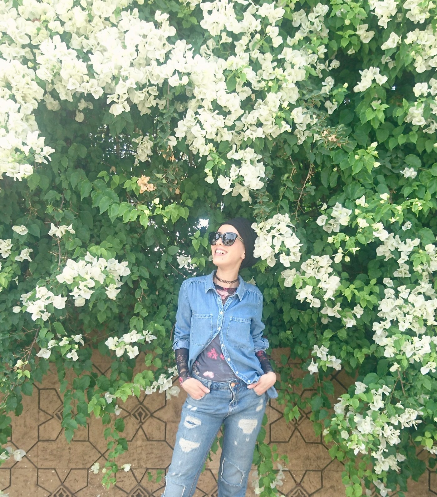 In order to keep the look from being too basic, I decided to layer the denim button-down on top of my floral see-through top, I left the button-down hanging loose and open to have sneak peeks of the layer underneath it. The beautiful flower pattern compliments the location of this shoot and I’m loving it.